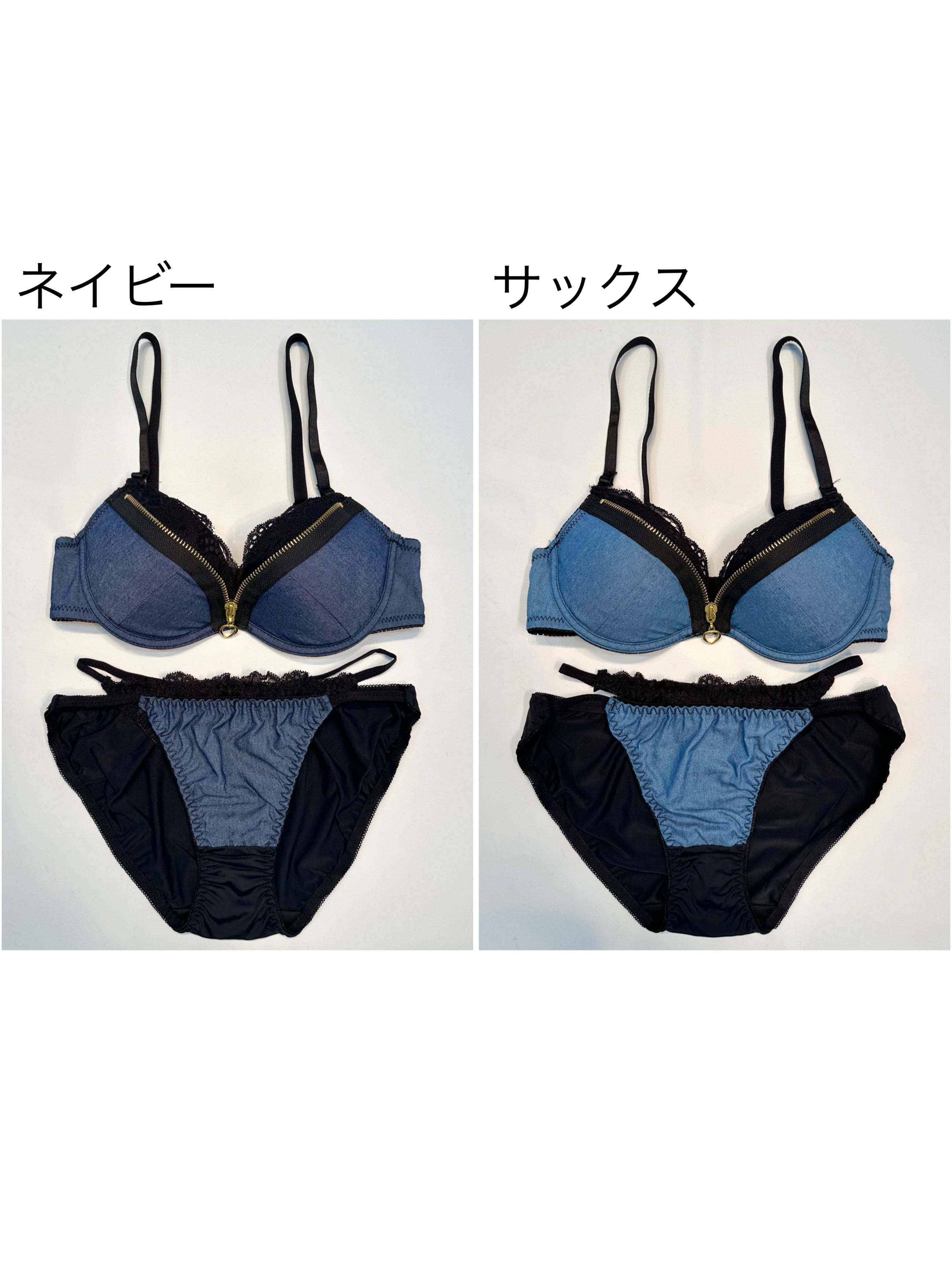 トレンドのデニム生地にブラックのレースをあしらったファスナーブラセット♡谷間を自由自在に形成するファスナーブラはサンロードのロングセラー商品です。 揺れ動くハート型のチャームも可愛らしいワンポイント◎ショーツはセクシーなレイヤード風デザインで、サイドの2本ストリングが腰元をすっきり魅せてくれます。