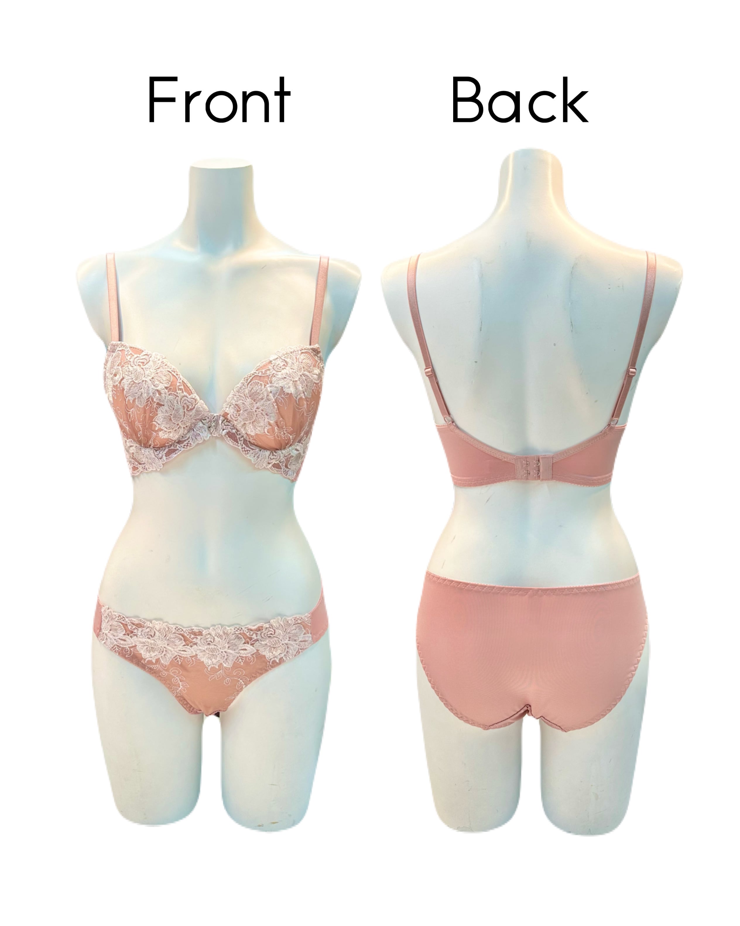 高級感あふれる大柄の刺繍レースが際立つブラセットです。バックスタイルはスムースなので普段使いしやすいのもポイント⭐︎