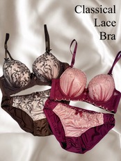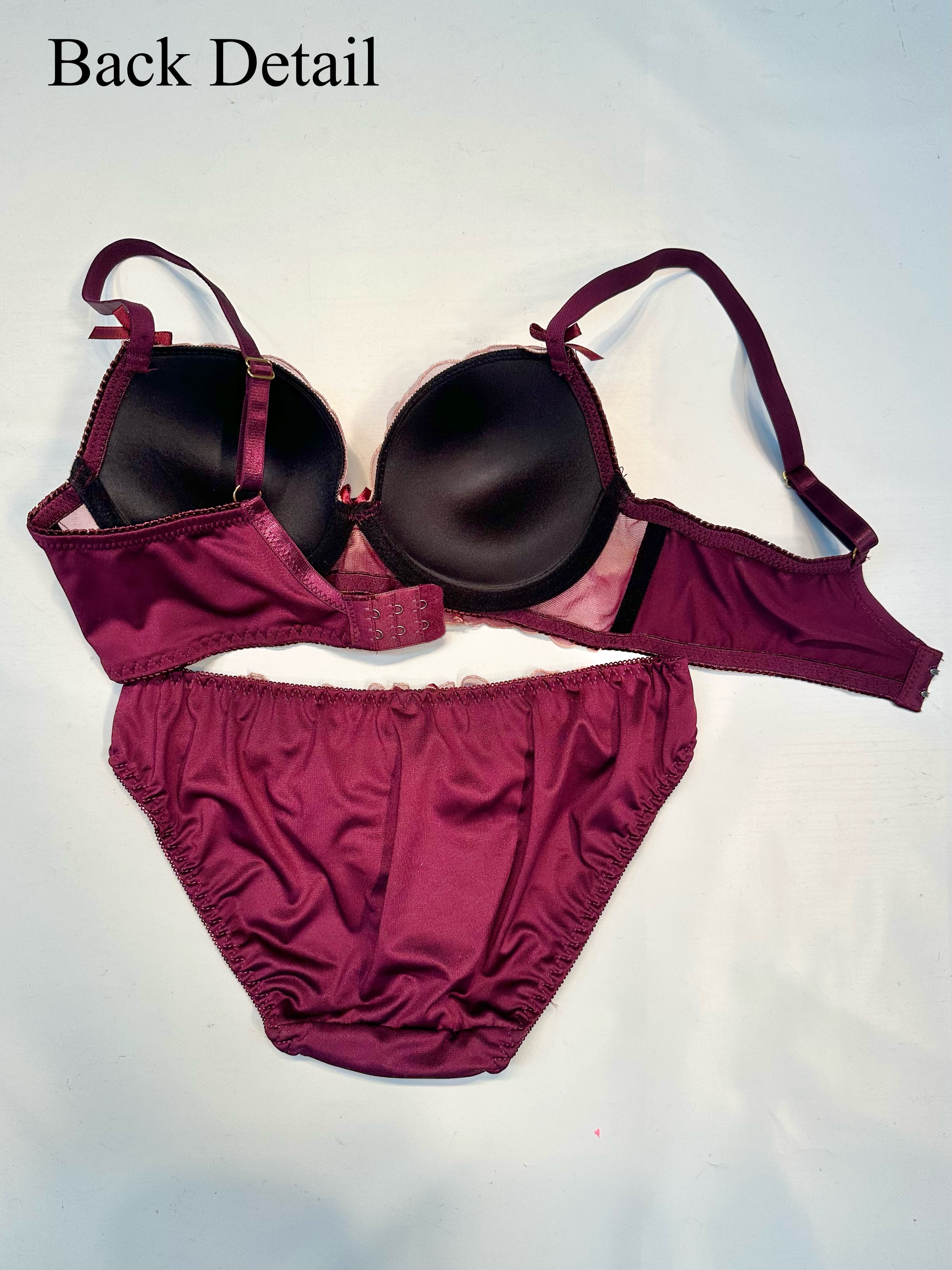 こっくりカラー×刺繍レースで絶妙なかわいさを放つブラセットです。深みのあるカラーなのに、カップが明るいので重たい印象にならないよう工夫しました。デザイナーのこだわり満載のデザインです。