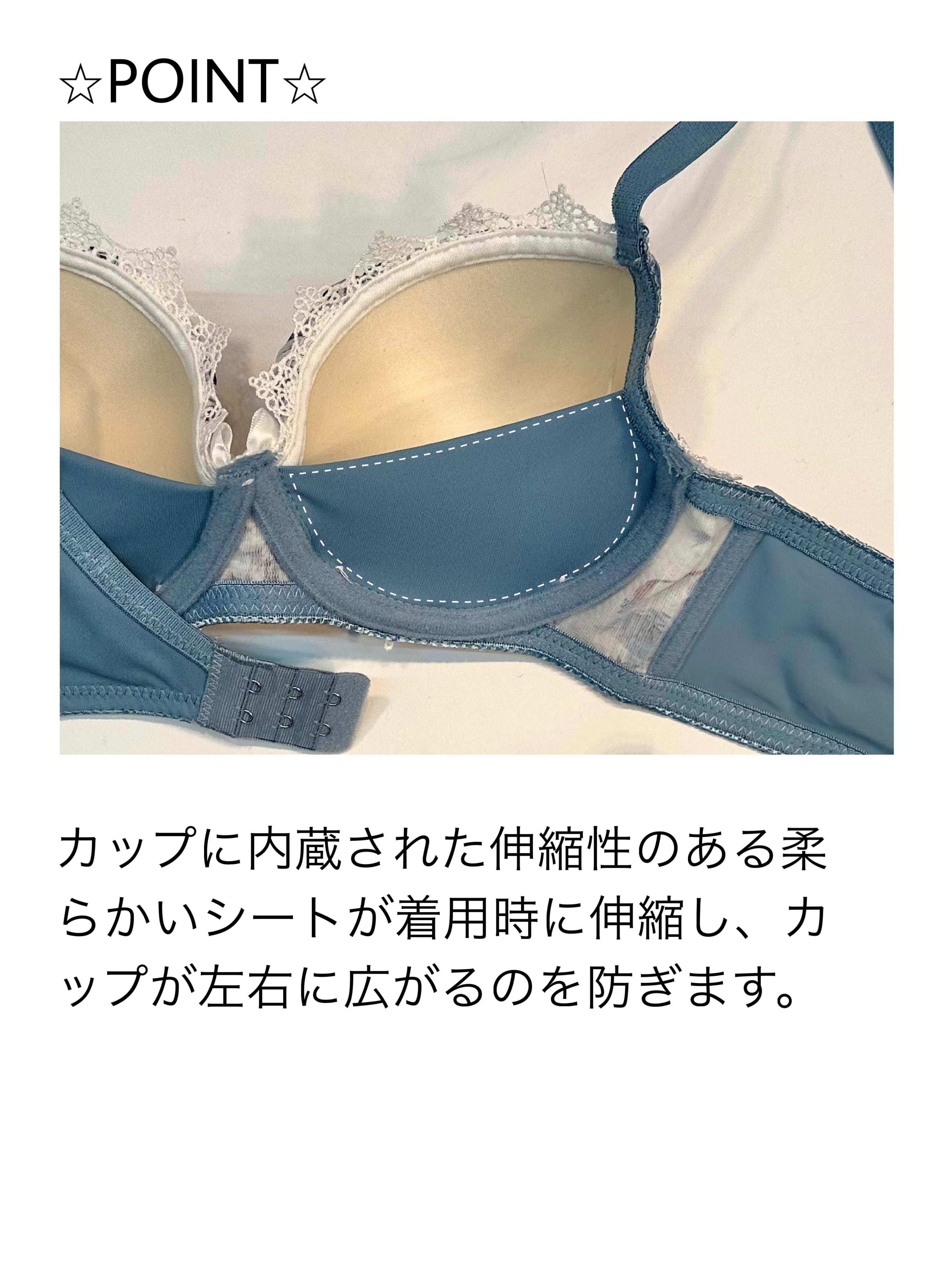 カップに内蔵された伸縮性のある柔らかいシートが、着用時に伸縮し、カップが左右に広がるのを防ぎます。